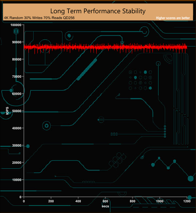 For the long term performance stability test, we set the drive up to run a 20-minute 4K random test with a 30% write, 70% read split, at a Queue Depth of 256 over the entire disk. The Kingston DC450R averaged 86,956 IOPS for the test, with a performance stability of 97%, which is the sort of figure you should expect to see for a drive aimed at data centre usage.