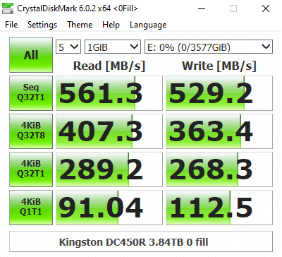 There isn't much to split between any of the three Kingston data centre drives (DC500M, DC500R and DC450R) that we've tested when looking at the 4K QD32 T1 test of the CrystalDiskMark benchmark. Comparing the two benchmark result screens it appears that the Phison PS3112-S12DC seems to prefer compressible data when reading 4K data at a QD of 1.