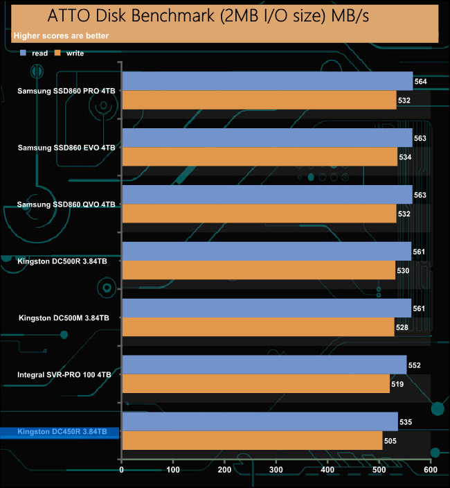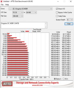 Officially the Sequential read/write performance for the 3.84TB DC450R is up to 560MB/s and 525MB/s respectively. Using the ATTO benchmark we couldn't quite hit those maximums with the review drive producing read/write figure of 535MB/s and 505MB/s respectively.
