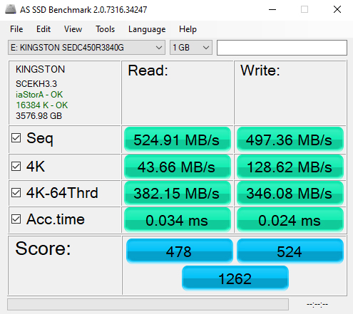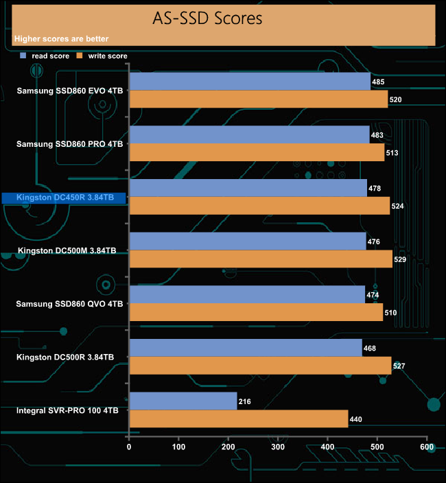 Of the three Kingston SATA based data centre drives we've tested to date, the DC450R just has the edge when it comes to the read score in AS-SSD but has the slowest write score of the three drives.