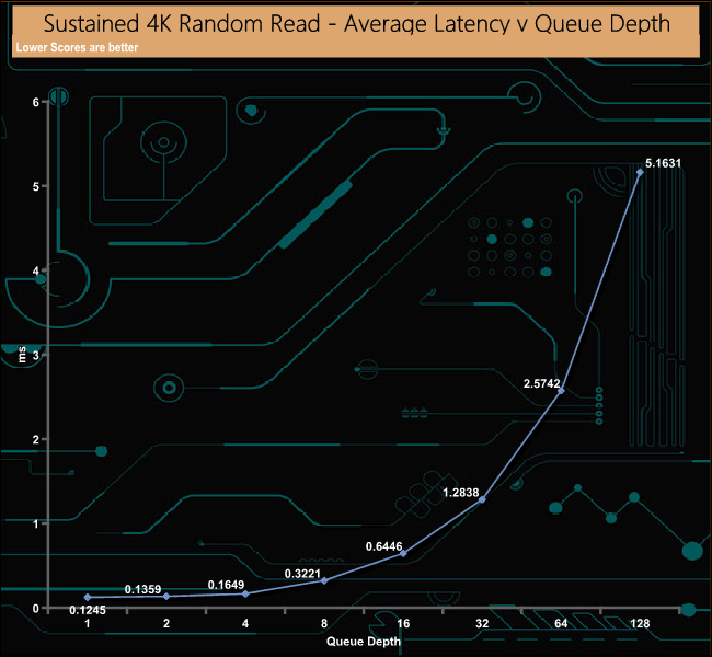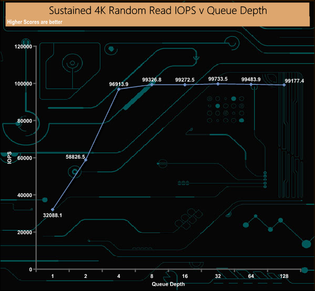Kingston rates the 3.84TB version of the DC450R as up to 99,000 IOPS for 4K random reads. With our 4-threaded tests, we managed to squeeze a little more out of the drive with a peak figure of 99,733 IOPS at QD of 32. After the initial burst from QDs 1 to 4 the drive's performance remained very consistent across the remainder of tested queue depths.