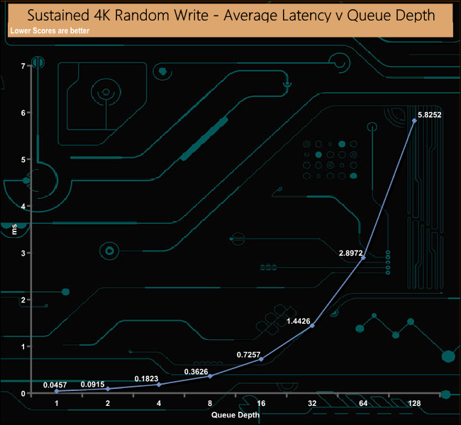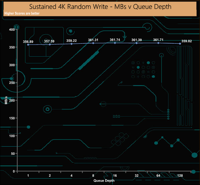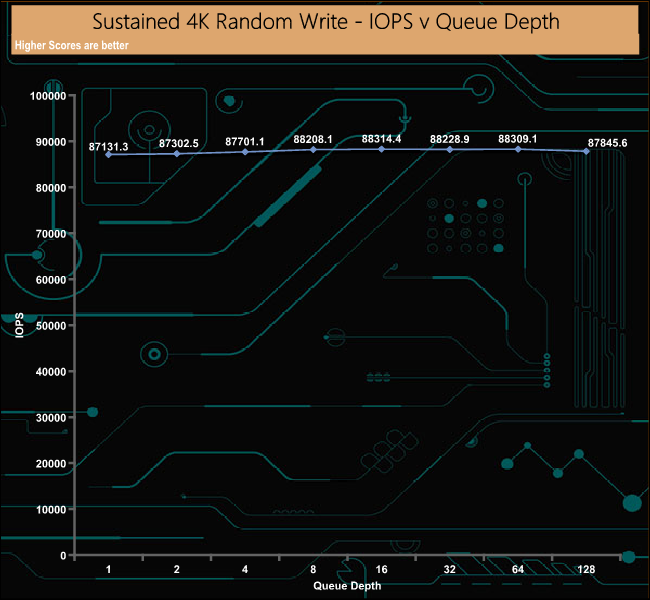 The official 4K random write performance figure for the drive is up to 26,000 IOPS. However, with our 4 threads, 8GB span write test, the drive sailed past this figure, peaking at 88,314 IOPS at a QD of 16. We then ran a test using 1 thread at a QD of 1 across the whole drive, which produced a figure of 35,391IOPS, a lot closer to the official figure. Unlike the random read performance, the drive was consistent from the start of our tests.