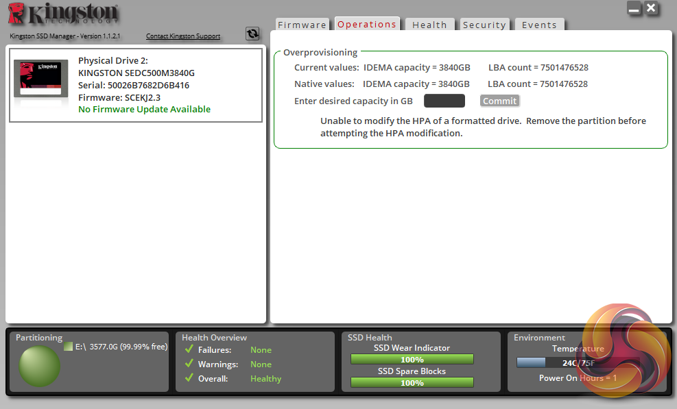 Kingston’s SSD management software utility is simply called SSD Manager. With it, you can monitor the health of the drive and how it’s being used, check the drive’s SMART data and update the firmware as well as securely erasing the drive. You can also adjust and manage the over-provisioning of the drive.