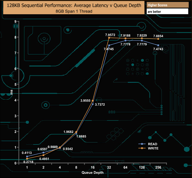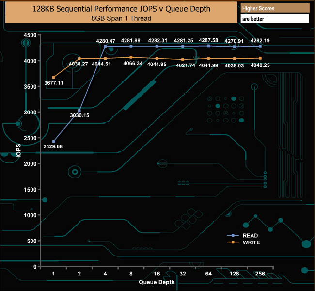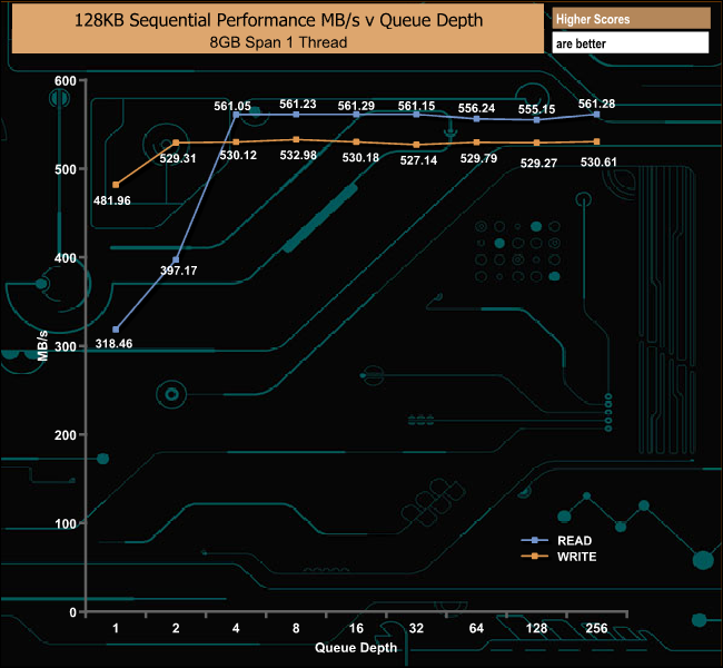 Officially the Sequential read/write performance for the 3.84TB DC500M is up to 555MB/s and 520MB/s respectively. We managed to squeeze a little more out of the drive with our Sequential tests with 561MB/s for reads and 530MB/s for writes.