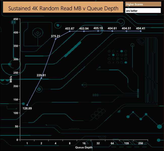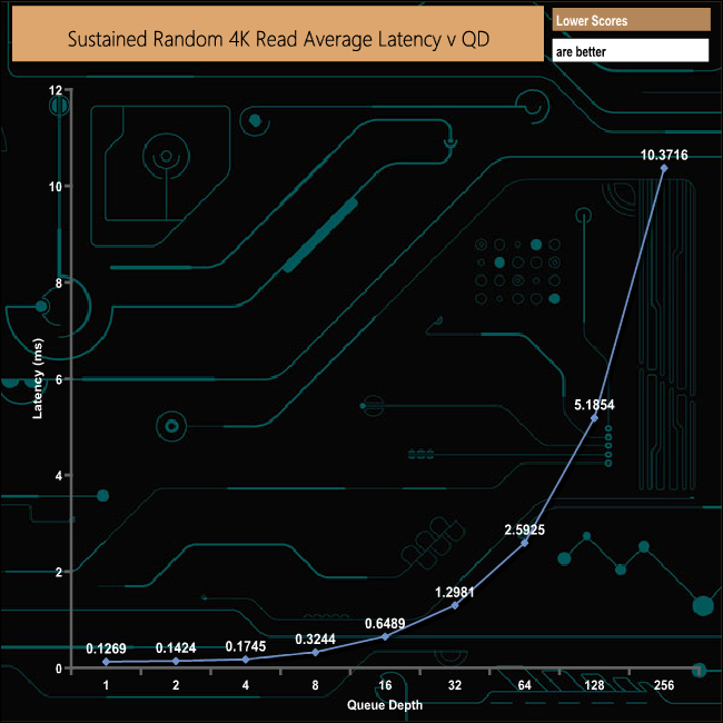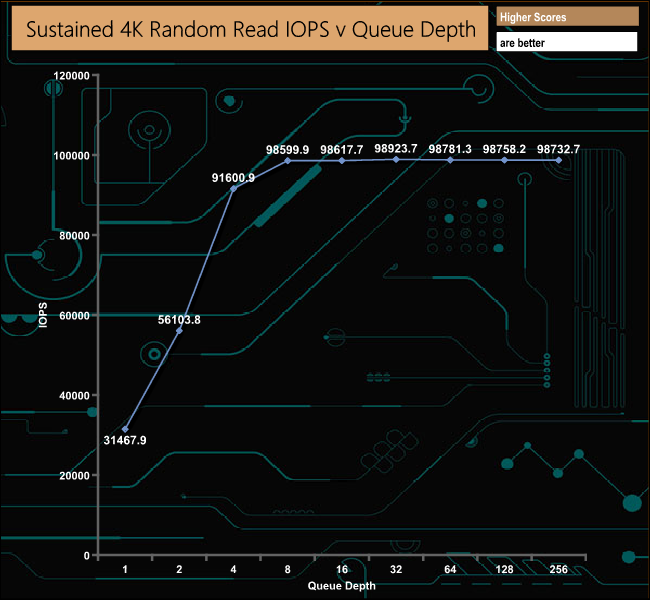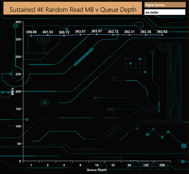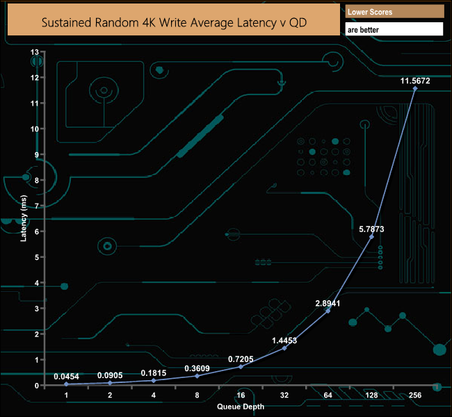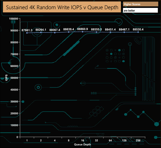 The official 4K random write performance for the drive is up to 75,000 IOPS. However, with our 4 threads, 8GB span write test, the drive sailed past this figure, peaking at 88,860.9 IOPS at a QD of 16. Unlike the random read performance, the drive is very consistent from the start of our tests.