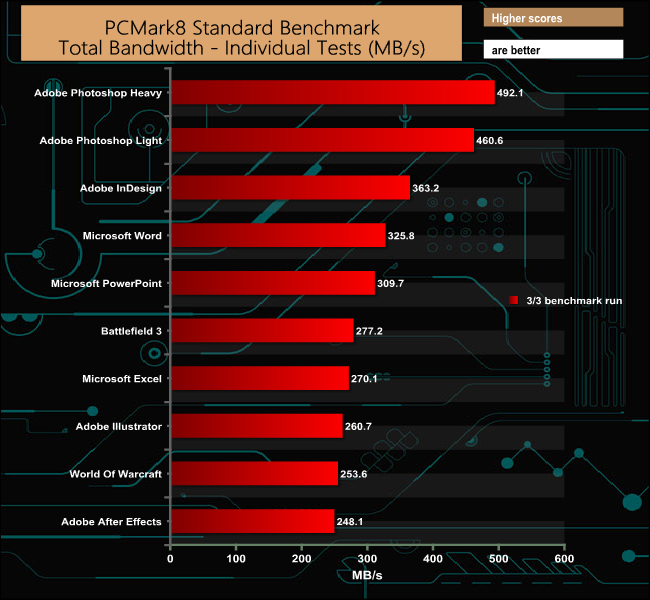 Futuremark’s PCMark 8 Standard Storage test saves a large amount of performance data. The default test runs through the test suite of 10 applications three times. Here we show the total bandwidth performance for each of the individual test suites for the third and final benchmark run.