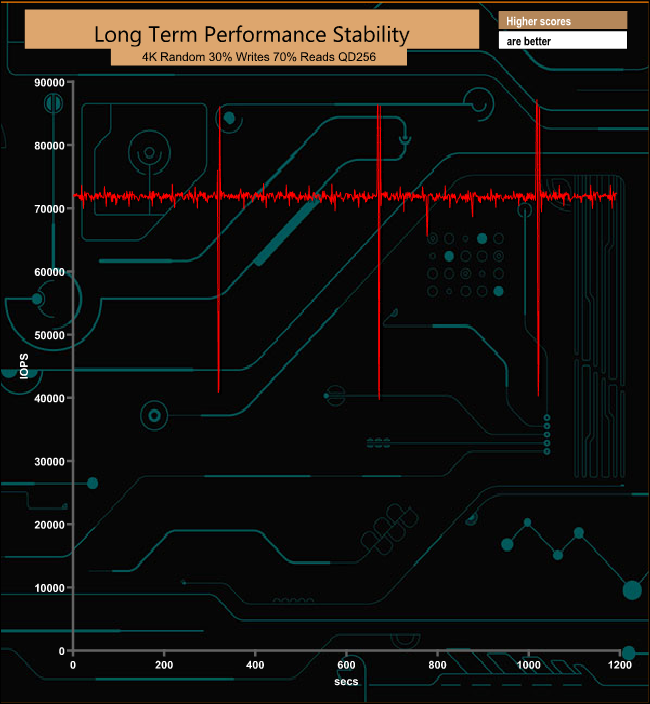 For the long term performance stability test, we set the drive up to run a 20-minute 4K random test with a 30% write, 70% read split, at a Queue Depth of 256 over the entire disk. The 3.84TB DC500R averaged 71,812 IOPS for the test with a performance stability of 93%, a figure you should expect from a drive aimed firmly at use in data centres.