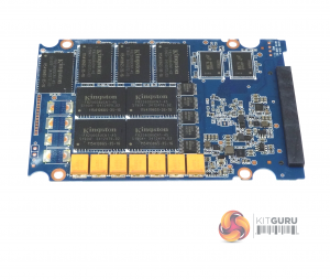 On one side of the PCB sit eight 256GB packages of Kingston branded Intel 64-layer 3D TLC NAND along with a pair of Micron DDR4-2666 DRAM chips. Also on side of the PCB are a row of tantalum capacitors for power loss protection. The other side of the board has yet more tantalum caps, eight further NAND packages, a couple more cache IC's and the Phison PS3112-S12DC controller.