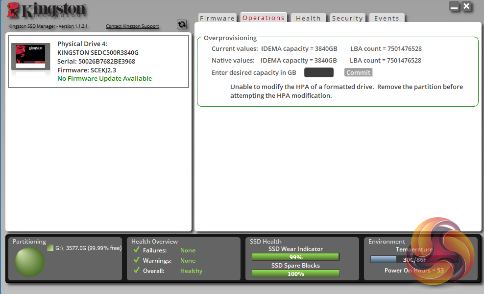 Kingston’s SSD management software utility is simply called SSD Manager. With it, you can monitor the health of the drive and how it’s being used, check the drive’s SMART data and update the firmware as well as securely erasing the drive. You can also adjust and manage the over-provisioning of the drive