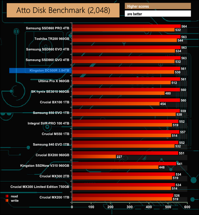Kingston's official Sequential read and write figures for the drive are up to 555MB/s for reads and up to 520MB/s for writes. With the ATTO benchmark, we managed to squeeze a little more out of the drive with a 561MB/s figure for reads with writes coming in at 530MB/s.