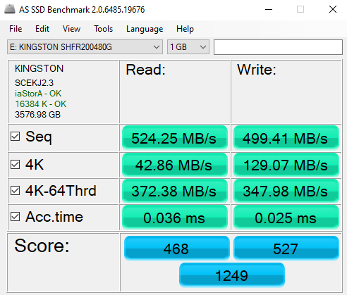 The ASSSD read score of 468 for the DC500R is enough to put the drive into fifth place in our results chart, but more impressive especially for a read-centric drive is the write score of 527, the second-fastest score we have seen for this group of SATA SSDs.