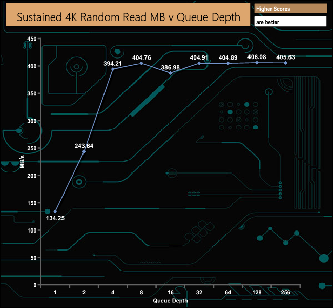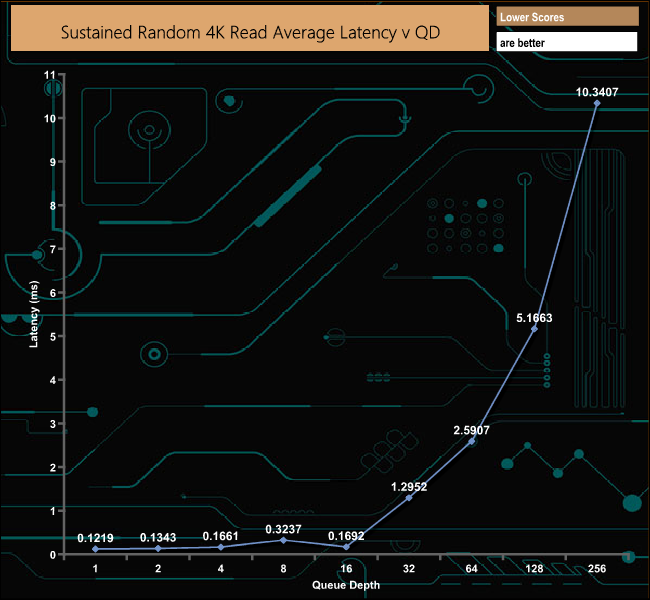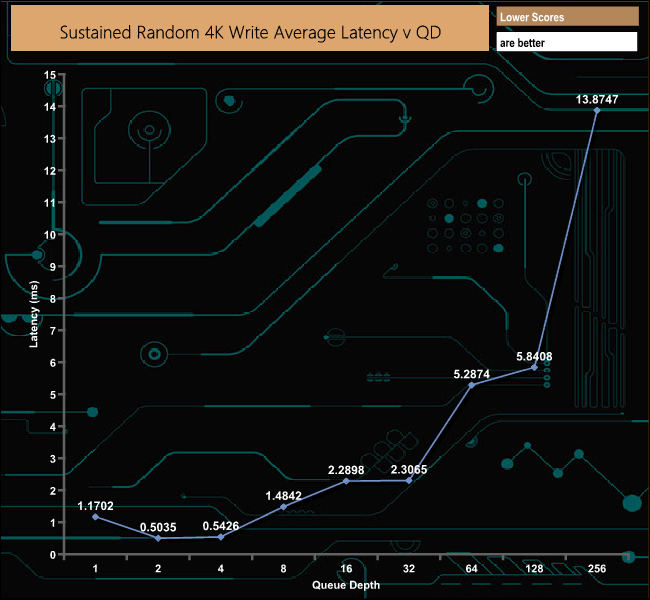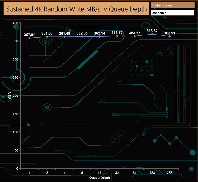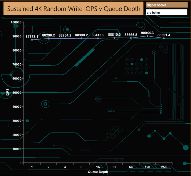 The official 4K random write performance for the drive is up to 28,000 IOPS. However, with our 4 threads, 8GB span write test, the drive sailed past this figure, peaking at 90,044 IOPS. We then tested again using 1 thread at a QD of 1 across the whole drive, the resulting 34,571 IOPS is lot closer to the official figure.