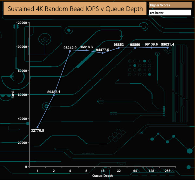 The official random read IOPS rating for the 3.84TB DC500R is up to 98,000 IOPS a figure that we could confirm with our 4K random read test, the drive peaking at 99,139.60 IOPS at a QD of 128.