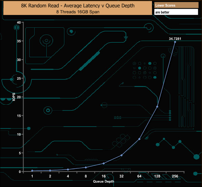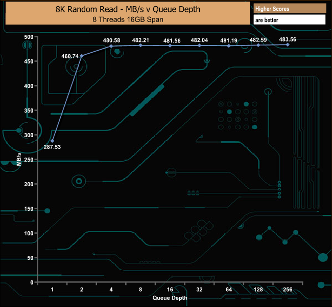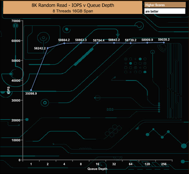We also pushed the drive a bit harder by testing at 8K (8 threads, 16GB span) to see how it would perform. The read performance peaks at 59,028 IOPS (483.56MB/s). Once again after the initial burst, it remained very consistent across the tested queue depth, the only downside is the very high latency while doing it.