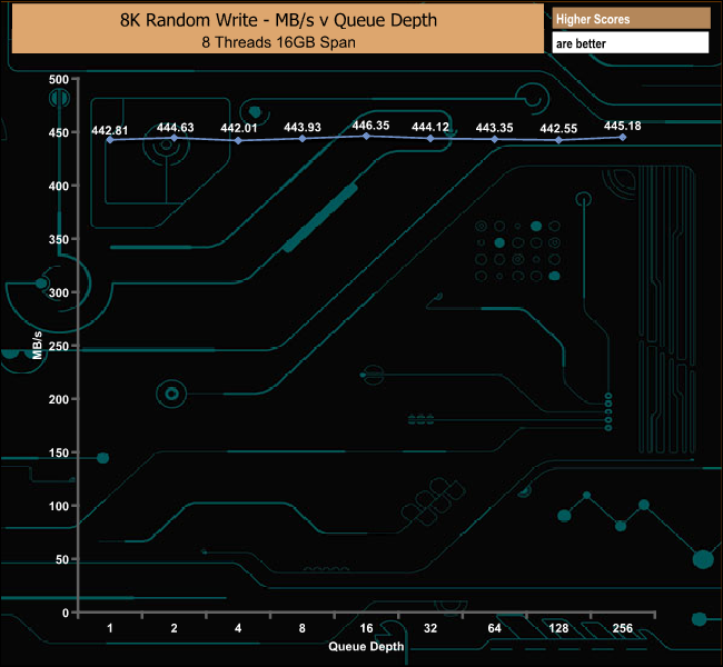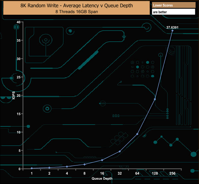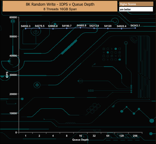 In the 8K random write test, the drive peaked at 54,485 IOPS at a QD of 16. But as with the 8K random read results the latency figures are very high.