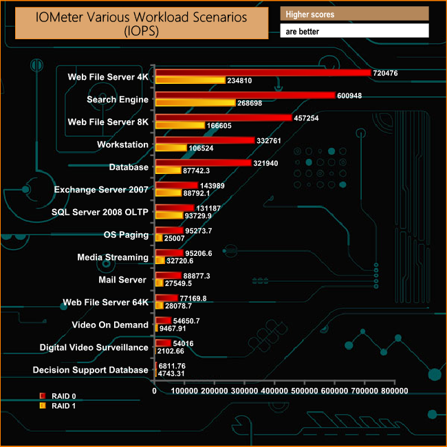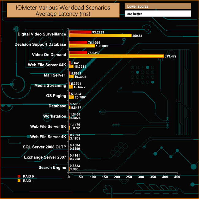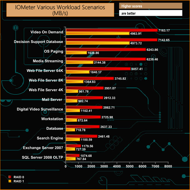 The DCP1000 provided some stunning numbers in these workload scenarios. The Video On Demand and Decision Support Database tests produced MB/s figures that surpassed the official top end figure of 6,800MB/s. The Video On Demand test produced a figure of 7,163MB/s while the Decision Support Database gave up a score of 7,143MB/s