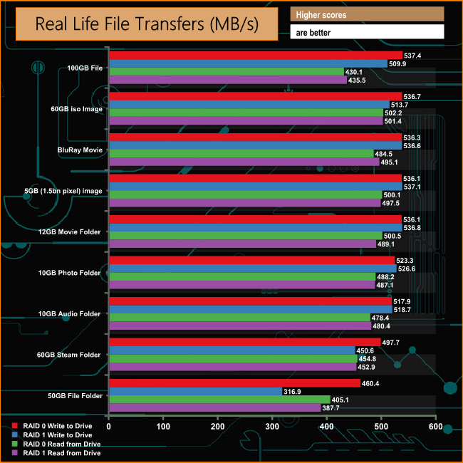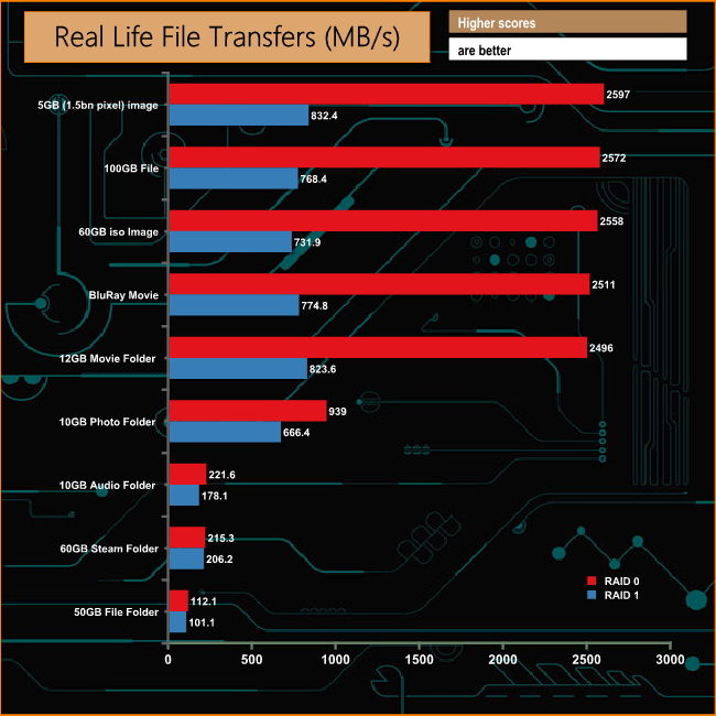 Just to see how fast the drive could transfer files we tested transfers from folder to folder on the drive. Once the SATA interface of our usual Samsung transfer drive was out of the way the drive really showed its muscle in RAID 0 but once again only on large file sizes. Our 100GB data file was moved between folders at 2,572MB/s or give to a better idea it took just 39.8 seconds to do it. The 5GB photo took 1.7 seconds and the BluRay movie a mere 17.5 seconds.