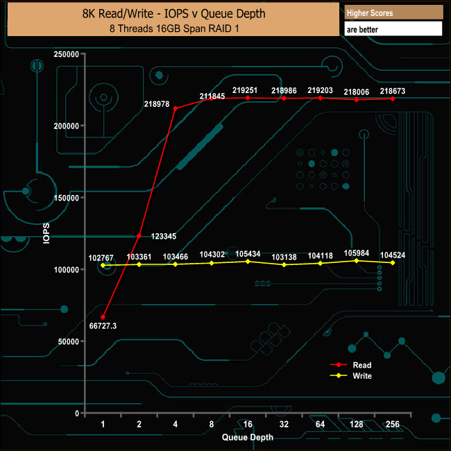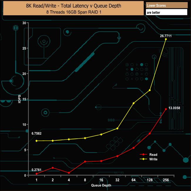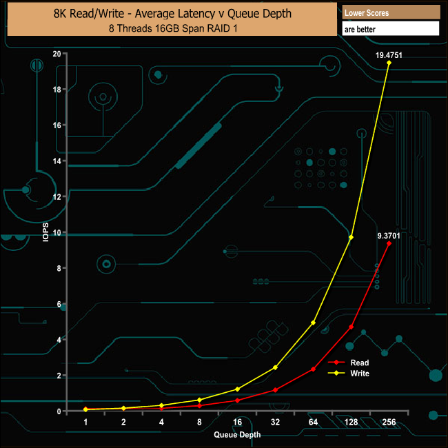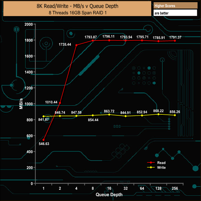 In RAID 1 it's the writes that have the advantage at the very beginning of the test, but its short lived as the write performance plateau's out all the way through the test from a start position of 841.87MB/s finishing at 856.26MB/s. Reads on the other hand start at a lower 546.63MB/s but climbed steadily to finish at 1,791.37MB/s.