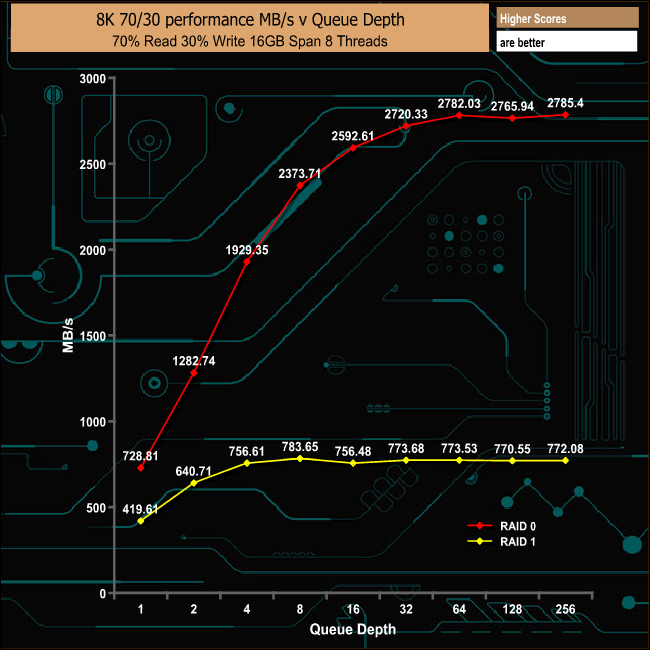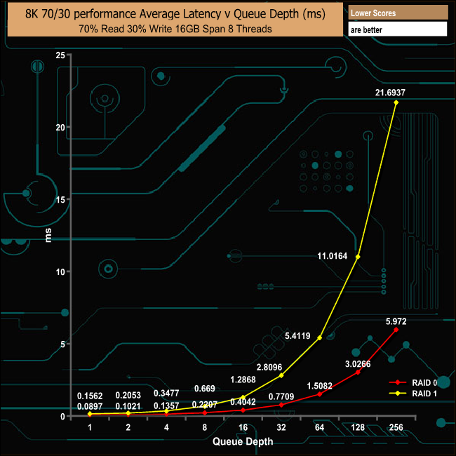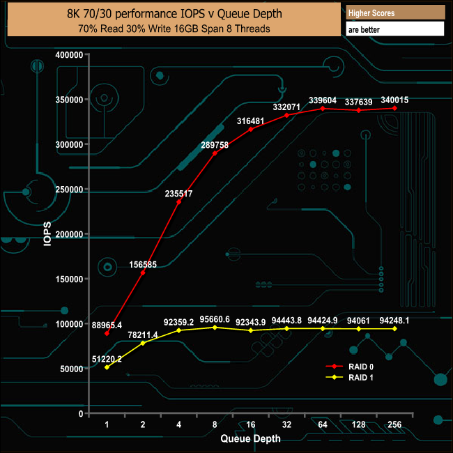 Testing the drive with a 8KB data block and a 70/30 read/write split, again another test with the enterprise environment in mind saw the drive produce 340,150 IOPS in RAID 0 while in RAID 1 the figure was 94,248 IOPS, again extremely strong figures.