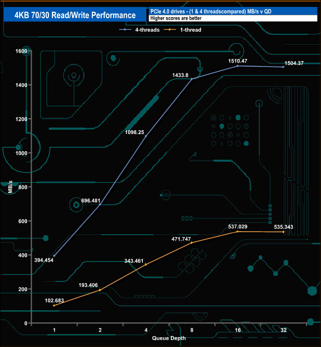 We used CrystalDiskMark 8’s custom settings to test the 4K 70/30 mixed read/write performance of the drive through a range of queue depths using a single thread and four threads.