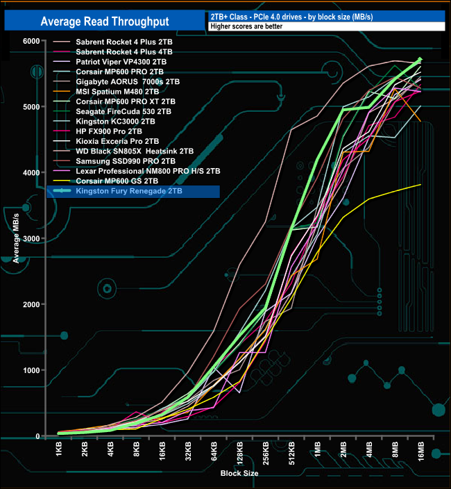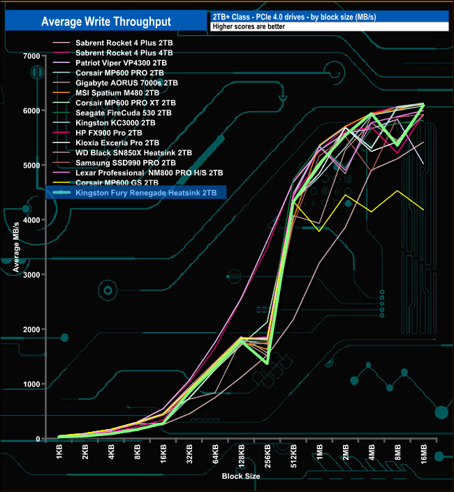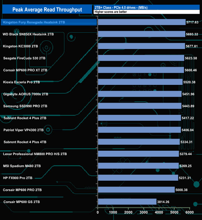In our read throughput test, the Kingston Fury Renegade Heatsink peaks at the end of the test run with 5,717MB/s, which is way short of the official maximum of 7,300MB/s. However, it may not reach the official maximum, but it is the fastest 2TB class consumer drive we've seen to date in our read-throughput test.