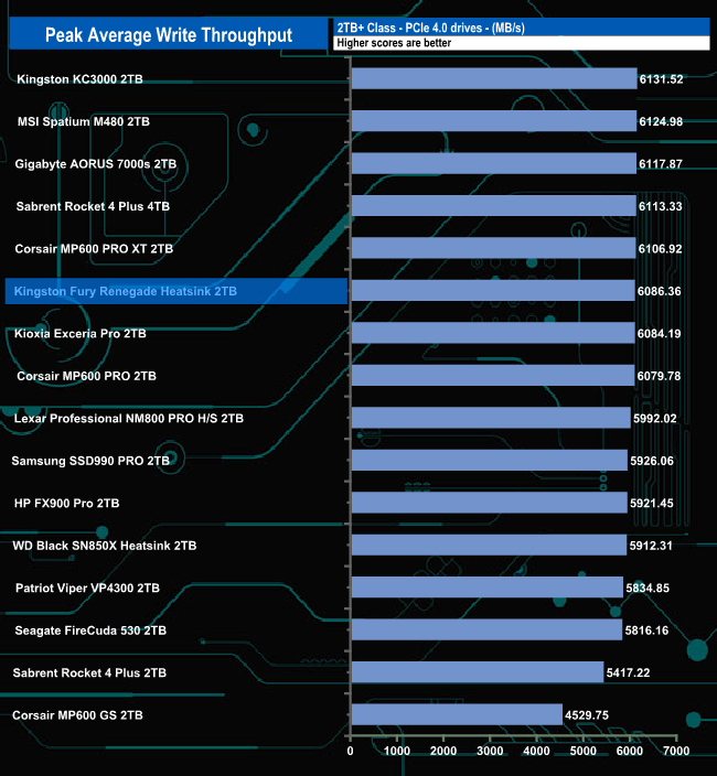 As with the read throughput test, the drive peaks at the end of the write throughput test with a score of 6,086MB/s, again some way off the official maximum speed of 7,000MB/s.