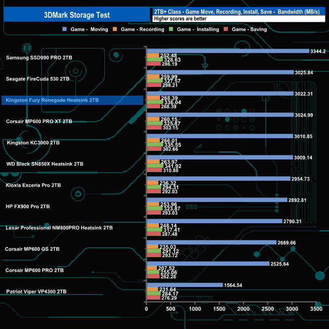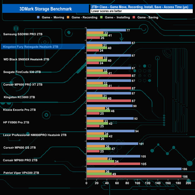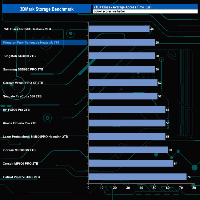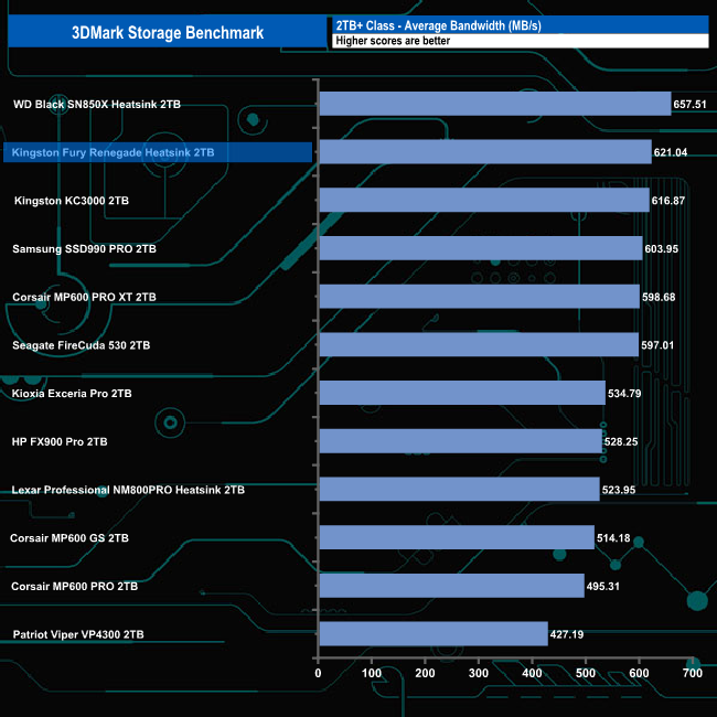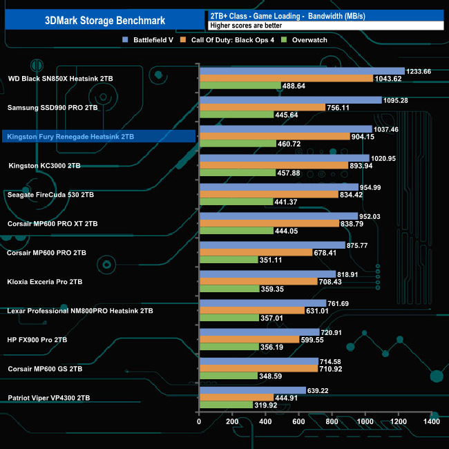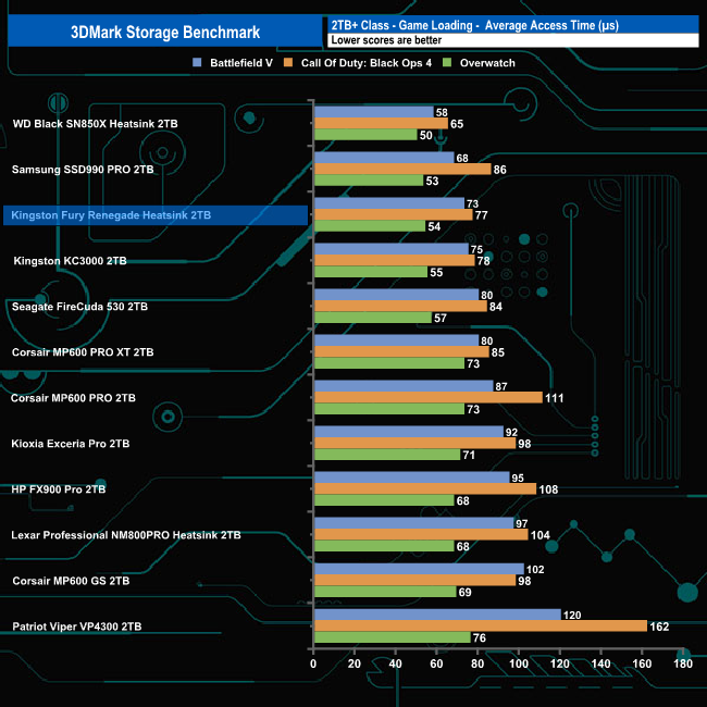 In 3DMark’s Storage Test, the 2TB Fury Renegade Heatsink sits in second spot behind WD's Black SN850X Heatsink for total average access time and average bandwidth for the test run. The average game loading bandwidth for the three games (Battlefield V, Call of Duty: Black Ops 4 and Overwatch) the benchmark uses is 800.77MB/s with an average access time of 68µs.