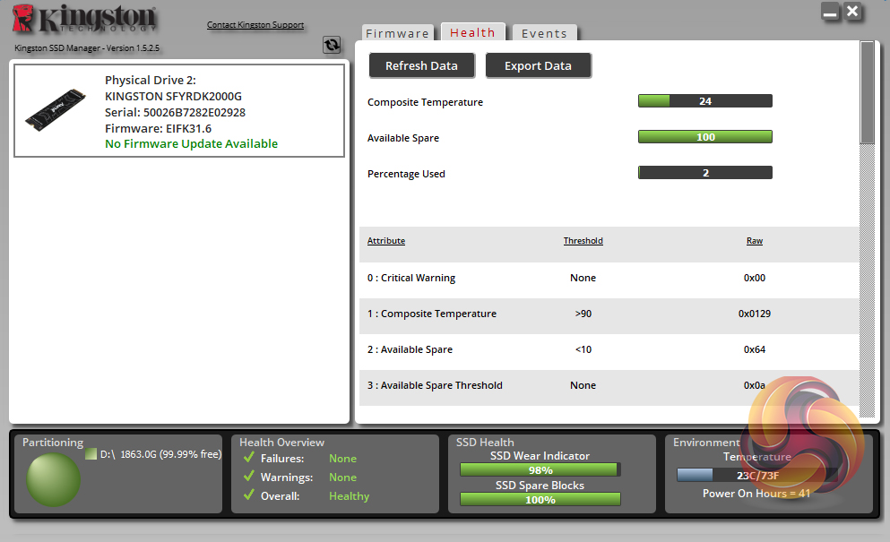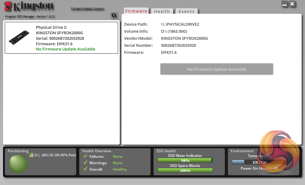 Kingston’s SSD management software utility is simply called SSD Manager. With it, you can monitor the health of the drive and how it’s being used, check the drive’s SMART data (including reliability tracking, usage statistics, life remaining, wear levelling and temperature) and update the firmware.