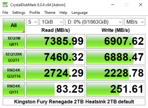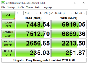 The CrystalDiskMark default set of tests confirms the official maximum Sequential read speed of 7,300MB/s with a test result of 7,385MB/s (7,448MB/s using the 0 fill tests) however, the write result of 6,907MB/s is a wee bit shy of the official 7,000MB/s.