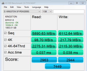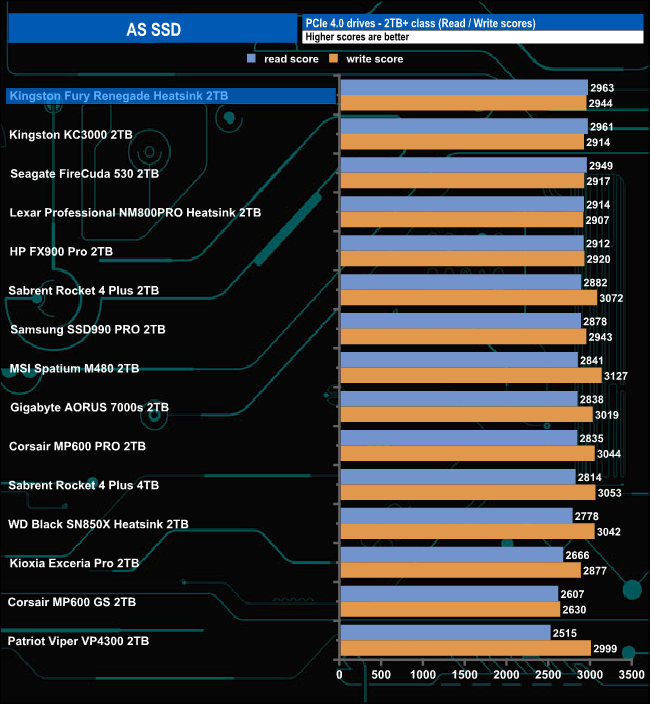The AS SSD read score of 2963 for the 2TB Fury Renegade Heatsink is the fastest we've seen to date for a 2TB class consumer Gen 4 drive. The write score of 2944 isn't quite as strong.