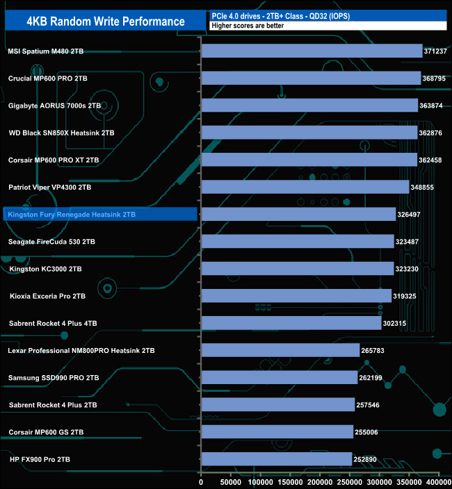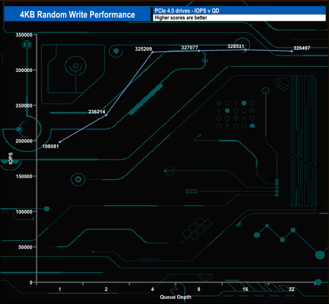 From QD4 up to QD32 the performance of the drive levels out, with a peak of 328,531 IOPS at QD16 before dropping back a little to finish the test run at 326,497 IOPS. As with the random read results, these are nowhere near the official 1,000,000 IOPS maximum write figure.