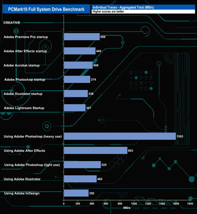 Switching over to the Adobe usage traces, the drive averaged 767MB/s, which includes the 1,593MB/s result for the Adobe Photoshop heavy usage trace. The slowest of the five traces was the InDesign trace at 350MB/s.