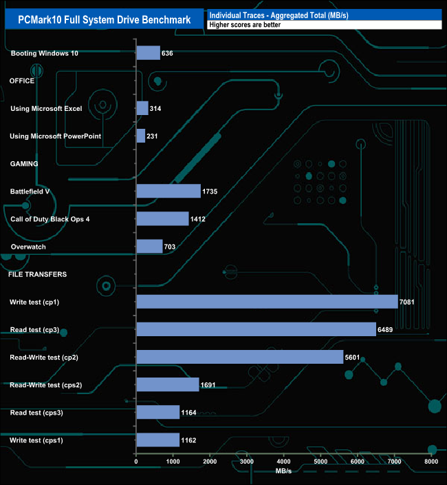 The three gaming traces produced an average result of 1,283MB/s, the fastest being Battlefield V at 1,735MB/s, next came Call Of Duty Black Ops 4 at 1,412MB/s and last and quite some way back, Overwatch at 703MB/s.
