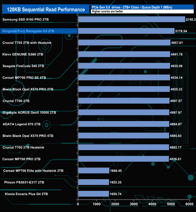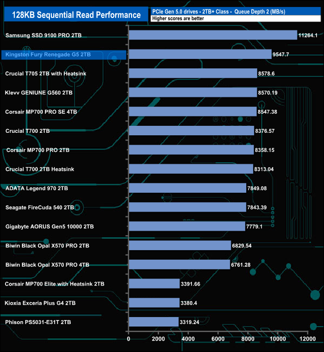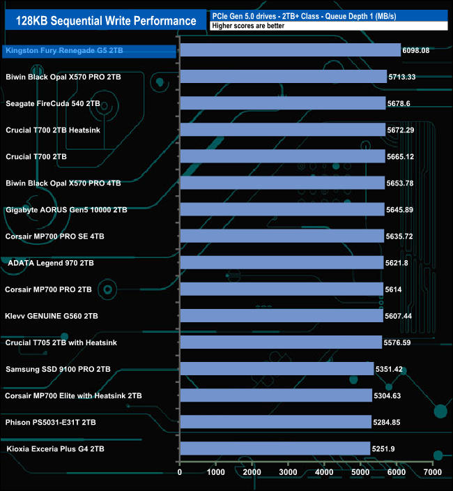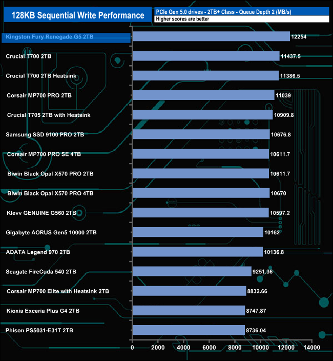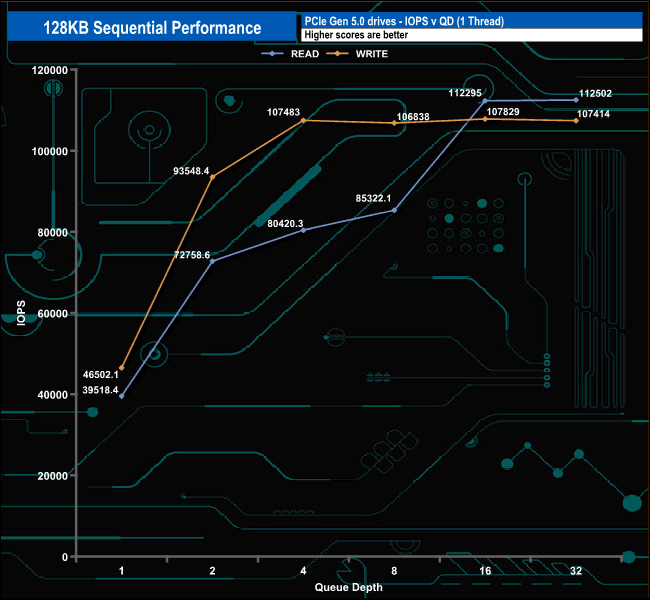 When it comes to the Sequential writes, the drive is very consistent, sitting in the top spot of the results chart across all the tested queue depths.