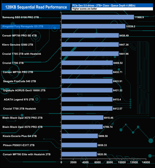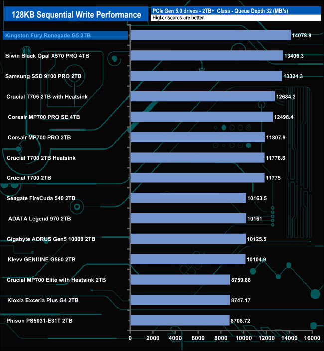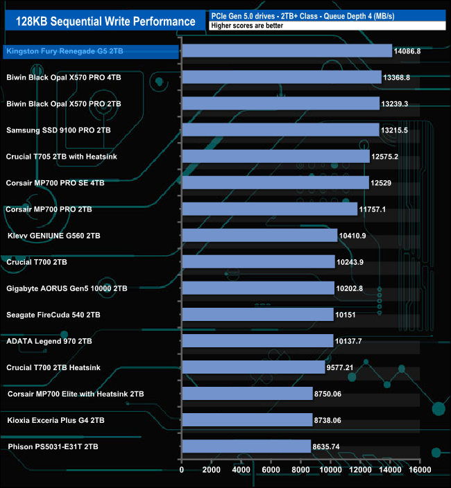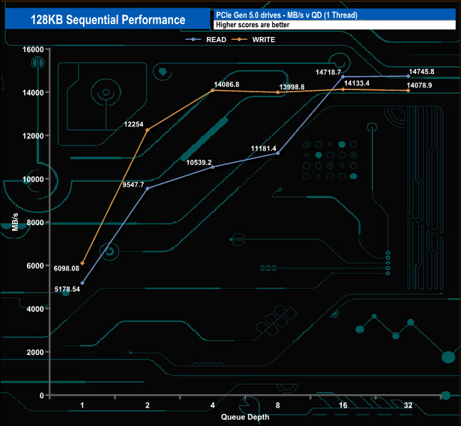 Using this Sequential test, the results confirmed the official Sequential ratings of the drive of up to 14,700MB/s and 14,000MB/s for read and write, respectively, with figures of 14,745MB/s for reads (QD32) and 14,133MB/s (QD16) for writes.