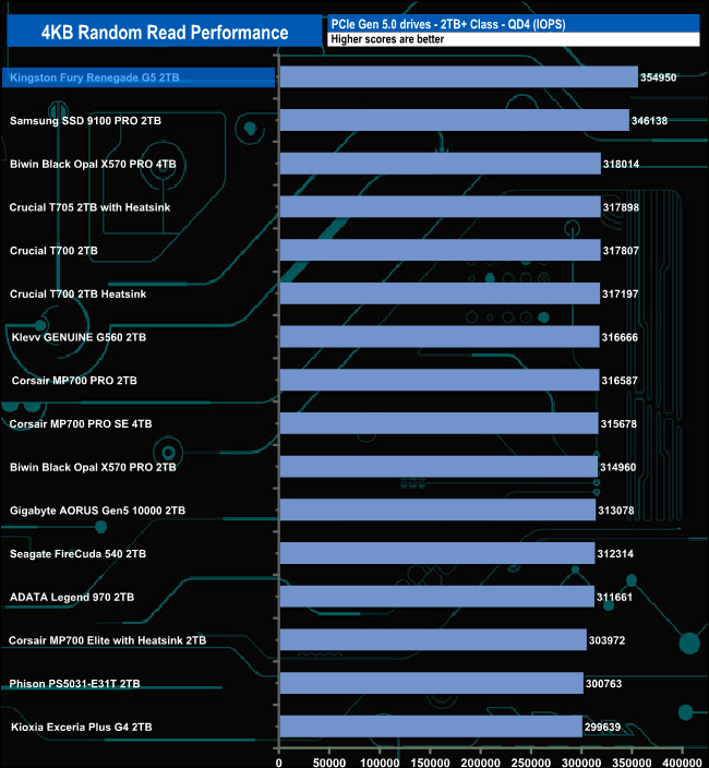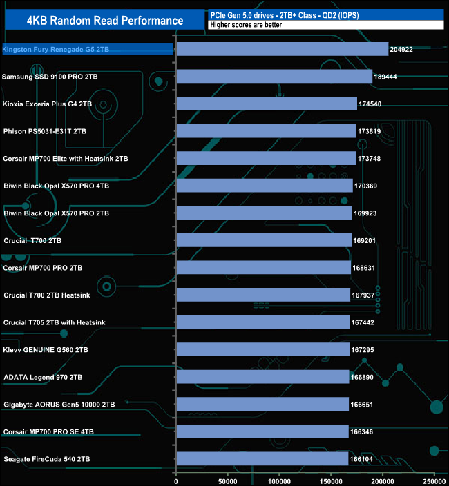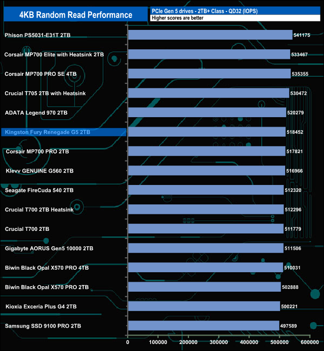 Even though our 4K random read test results were nowhere close to the official maximum figure at any stage, the drive sits in the top spot at QD1, 2 and 4, by quite a margin. However, at QD32, it has slipped down the chart, ending up in sixth place.