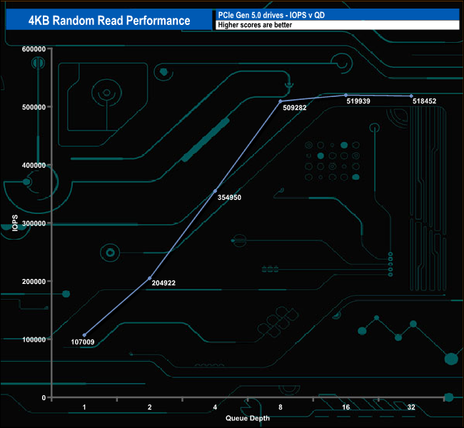Using our 4-threaded random read 4K tests, we couldn't get close to the official maximum of 2,200,000 IOPS. The best test result was 519,939 IOPS at a queue depth of 16 before the performance backed off a little to finish the test run at 518,452 IOPS (QD32).