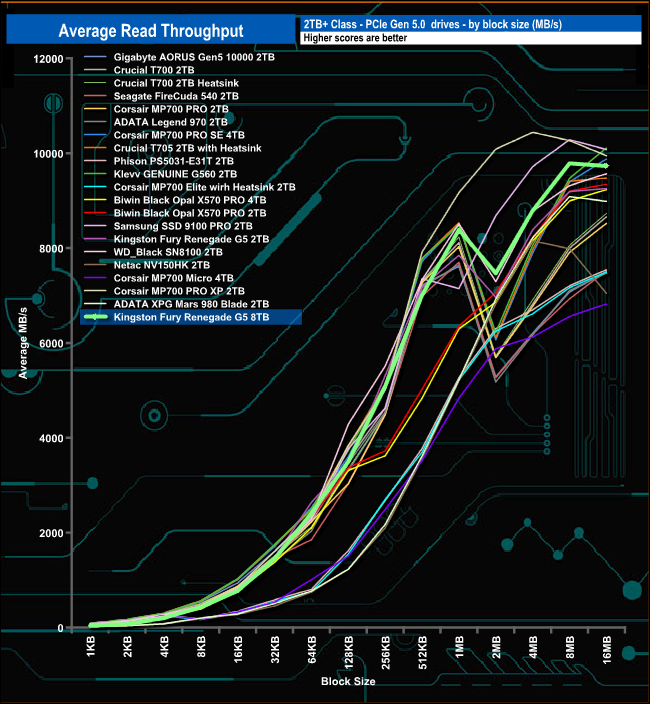 In our read-throughput test, the drive peaked at the 8MB block size at 9,787.16MB/s, quite some way short of the official maximum of 14,800MB/s.