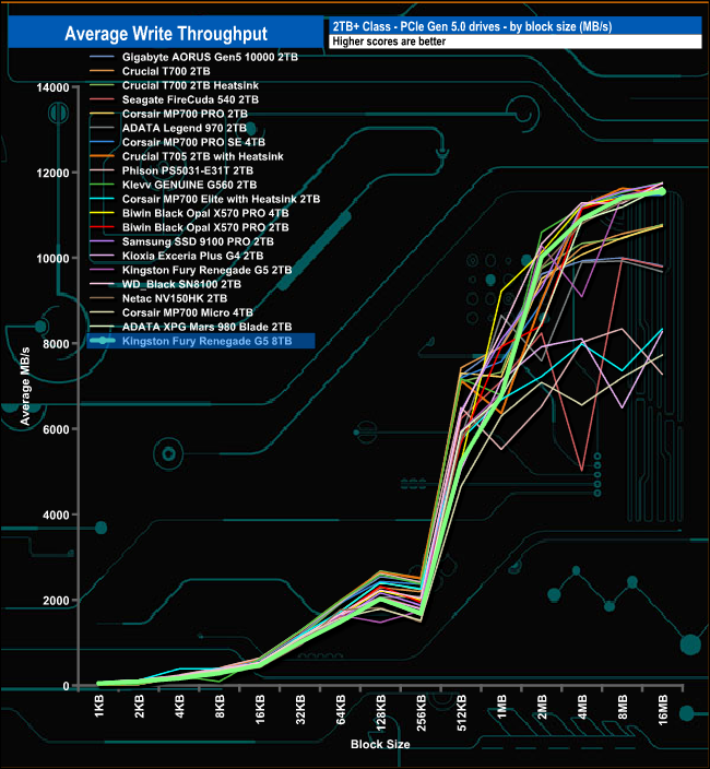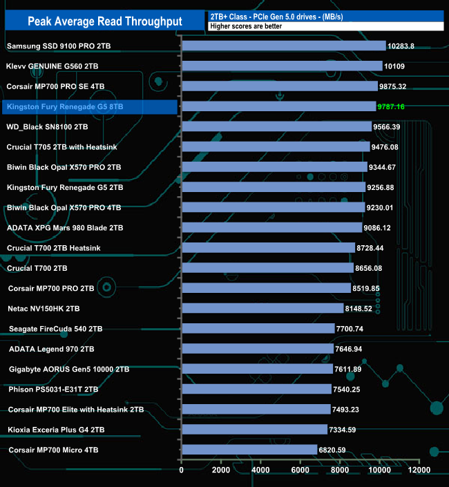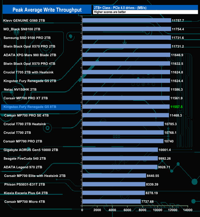 The peak write result of 11,557MB/s sees the drive in a mid-table position, 67MB/s slower than the 2TB Fury Renegade G5.