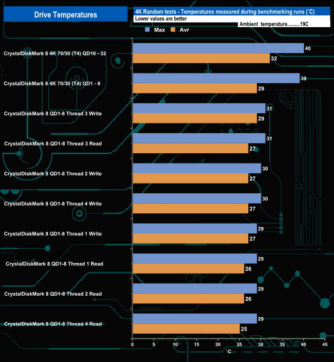 The drive has a few design features to combat the Achilles heel of high-end Gen5 drives, which is heat generation. Chief amongst these is the Silicon Motion SM2508 controller, which uses a TSMC 6nm process rather than the 12nm process used by previous-generation controllers, enabling better thermal management. It works well enough, as the hottest the drive got while benchmarking was 40° C during a CrystalDiskMark 8 default Write test run. For the bulk of our testing, the drive averaged 35° C, with the 4K-focused tests averaging 30° C, both well below the drive's 70° C maximum operating temperature.