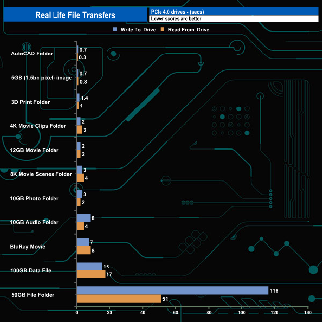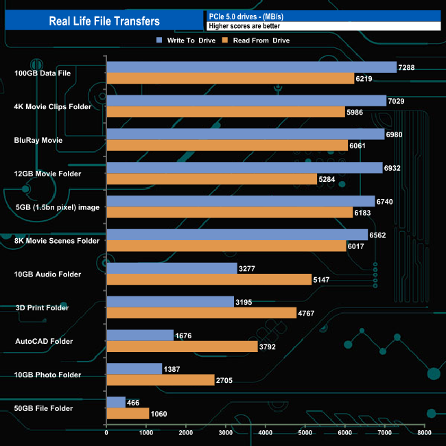 The 8TB Kingston Fury Renegade G5 averaged 4,684MB/s when writing the eleven transfer tests, with the fastest being the 100GB data file at 7,288MB/s (15s transfer time), the slowest being the 50GB file folder at 466MB/s (116s transfer time). Reading back the data, the average was 4,838MB/s with the fastest being the 100GB data file once again at 6,219MB/s (17s) and again, the slowest was the 50GB File Folder at 1,060MB/s (51s transfer time).