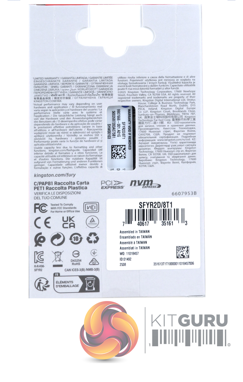 The 8TB Kingston Fury Renegade G5 is a double-sided design. On one side of the PCB sits a Silicon Motion SM2508 eight-channel controller along with two Kingston re-branded 2TB 218-layer 3D TLC NAND packages. On the other side of the PCB are another pair of NAND packages along with an 8GB LGDDR4-4266 DRAM IC.