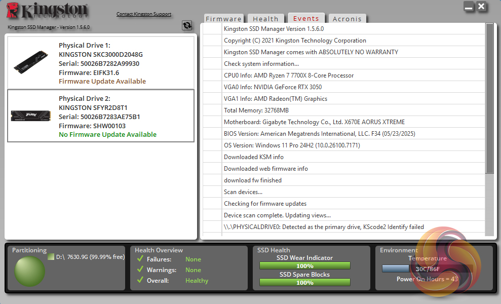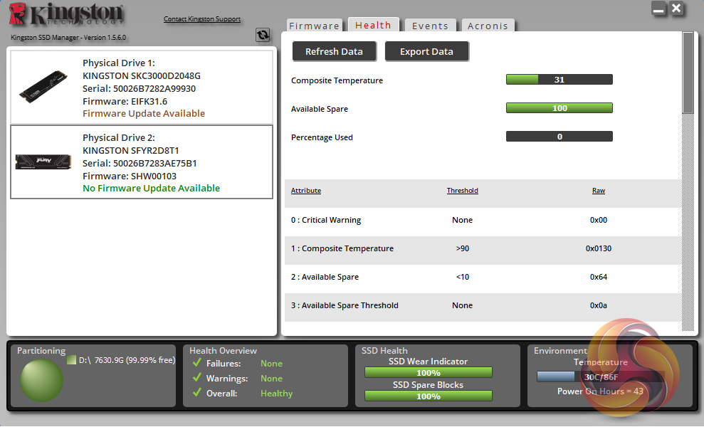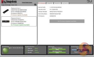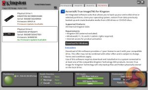 Kingston’s SSD management utility is called SSD Manager (version 1.5.6.0 at the time of testing the drive). It automatically detects any firmware updates, displays drive status, temperatures and SMART information, as well as a link to download Acronis imaging/cloning software.