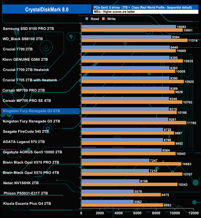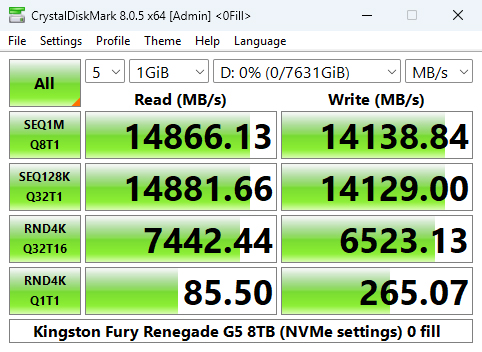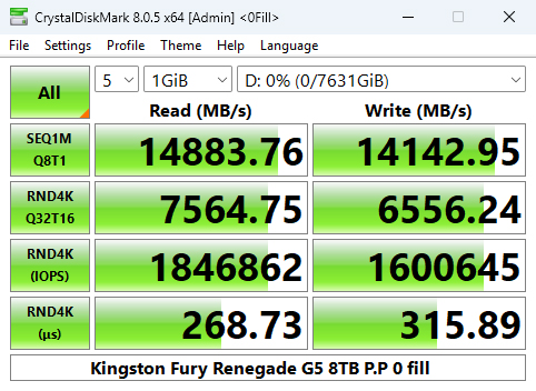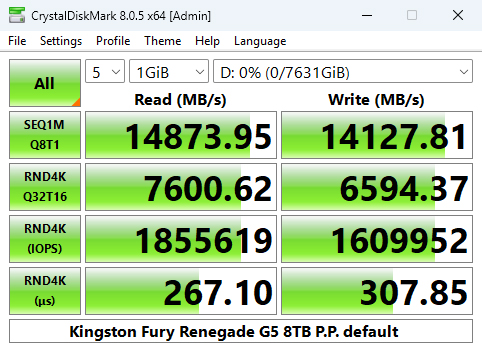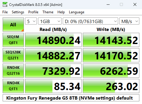 That 14,890MB/s read result places the 8TB Fury Renegade G5 into second place on the results chart, 125MB/s faster than the 2TB model, while its write score of 14,143MB/s is just 13MB/s faster.