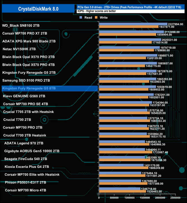 The 8TB Fury Renegade G5 is officially rated as up to 2,200K IOPS for random reads and random writes. Using the Peak Performance profile test in CrystalDiskMark 8, we couldn't reach those official maximums. The best read result we saw was 1,855,619 IOPS, slightly down on the 2TB model, with the best write figure at 1,609,952 IOPS, which is up on the 2TB Fury Renegade G5.