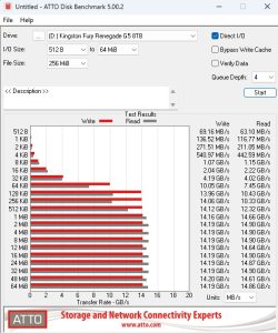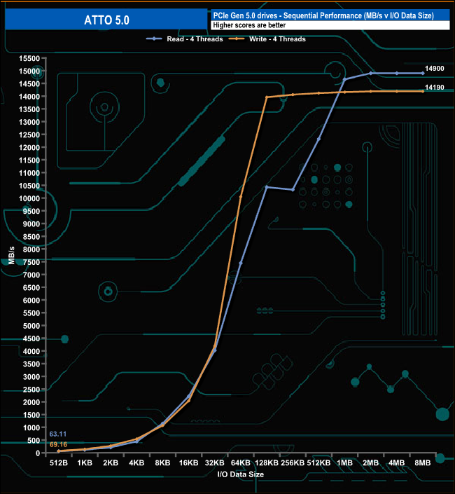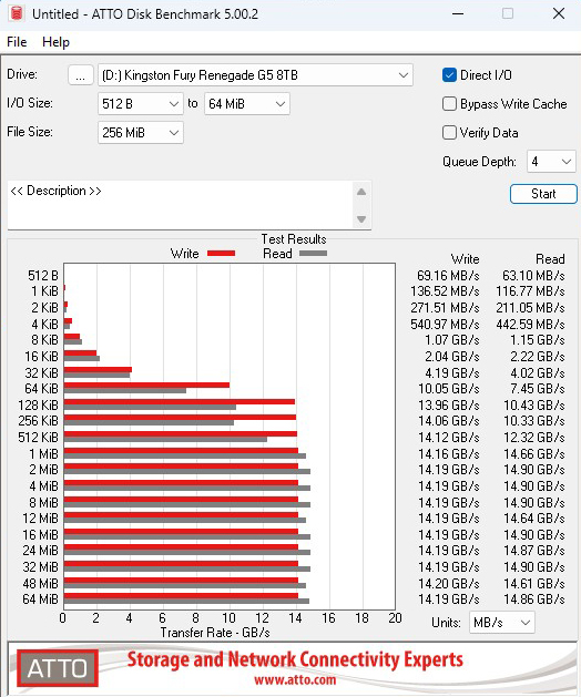 Using this more up-to-date version of ATTO, we could confirm the official Sequential ratings with a read test result of 14,900MB/s and 14,190MB/s for writes.