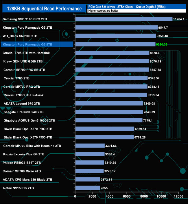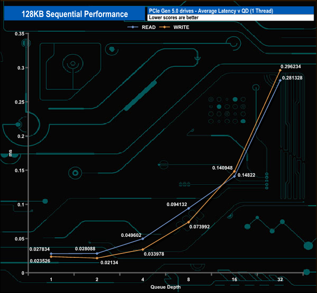 We used CrystalDiskMark 8‘s custom settings to test the Sequential read and write performance of the drive through a range of queue depths. The setup for the tests is listed below.