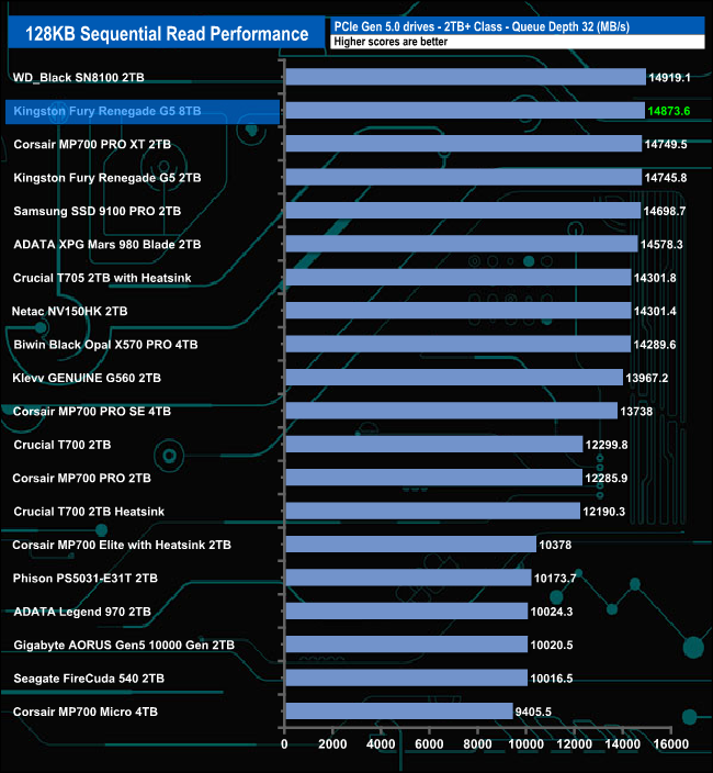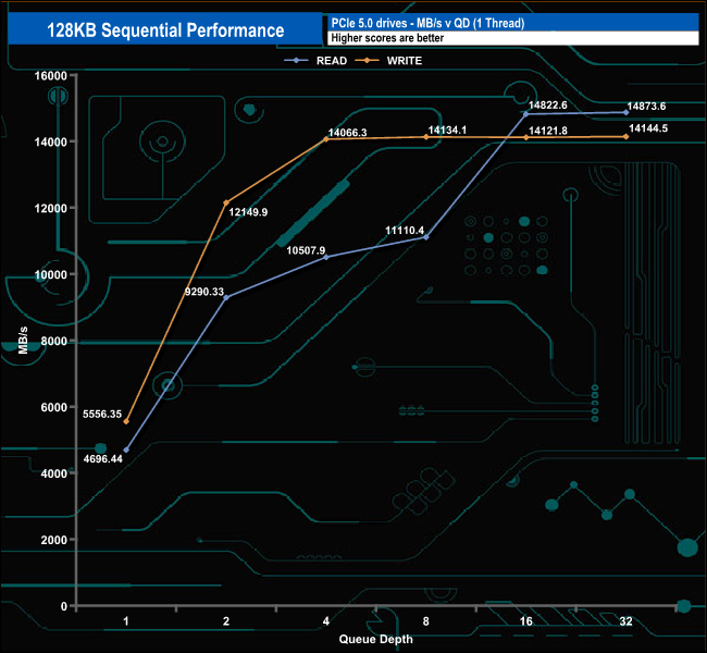 Using this Sequential test, the results confirmed the official Sequential ratings of the drive of up to 14,800MB/s and 14,000MB/s for read and write, respectively, with figures of 14,873MB/s for reads and 14,144MB/s for writes both at Q32.