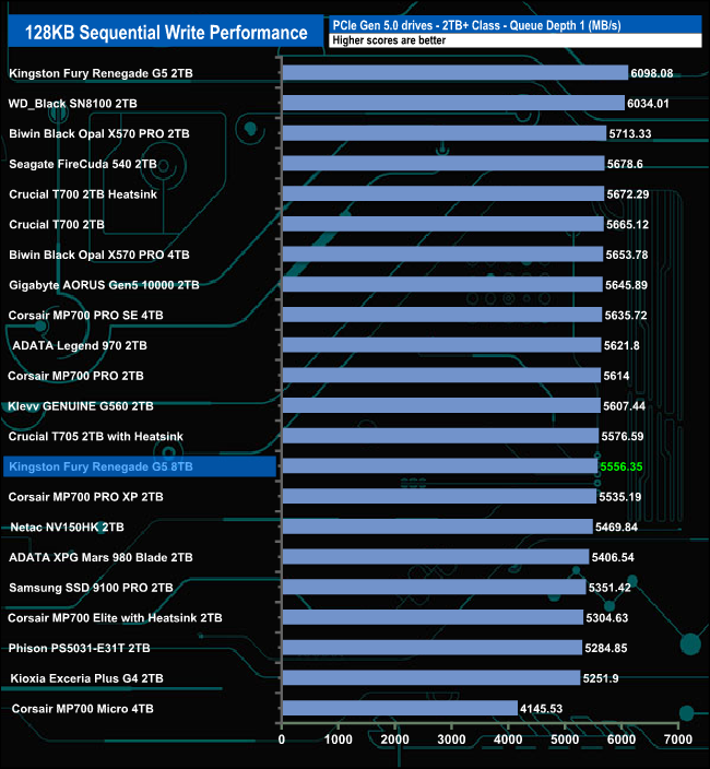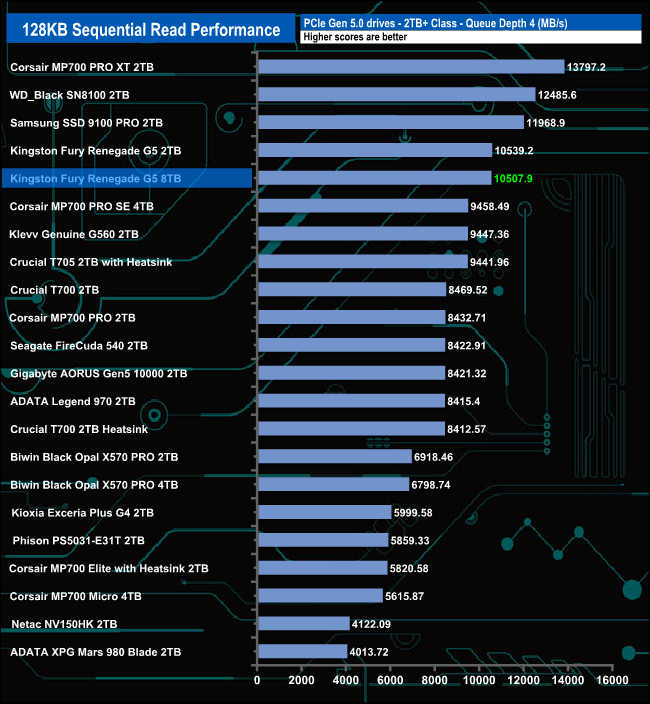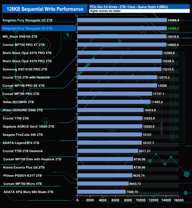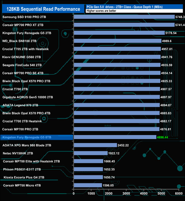 At QD1, the 8TB version of the Fury Renegade G5 is slower than the 2TB version. At QD2 and QD4, the difference between them narrows, but at QD32, the positions swapped, with the larger drive faster.