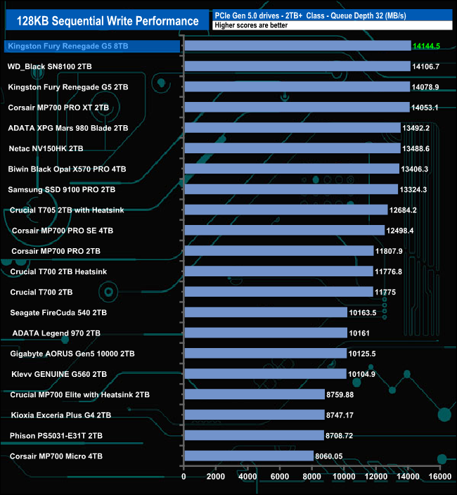 When it comes to the Sequential writes, the 8TB drive is a lot slower than the 2TB version at QD1, however, as the queue depths deepens, the drives get closer to one another until at QD32, the 8TB drive takes over from the 2TB drive and at 14,144.5MB/s its the fastest consumer Gen 5 drive we've seen to date.